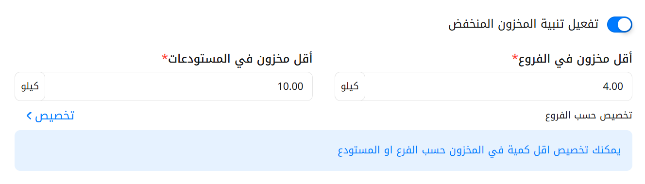 - يمكنك تفعيل تنبية اذا تم انخفاض المخزون الموجود في الافرع او المستودعات بالنقر على زر التفعيل